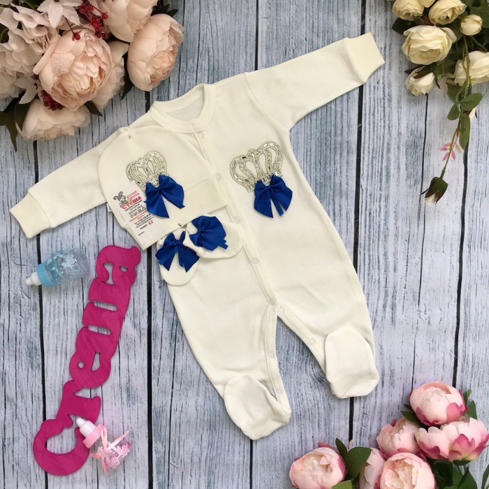 Комбинезон "Корона"+ шапка + царапки из интерлока-пенье. Украшен аппликацией из страз и бантами.