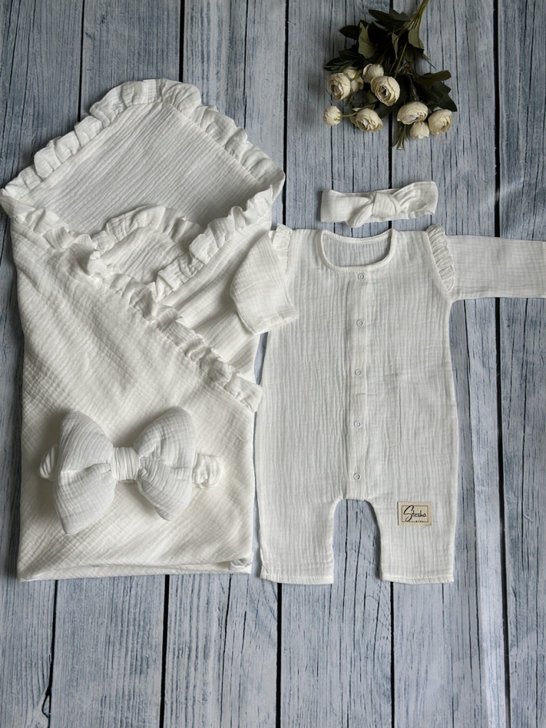 Теги: Купить детские конверты, комбинезон оптом, детские конверты на выписку оптом. 335-М. Комплект из детского комбинезона, р 56 и конверта муслин, хлопок 100% 90/90 см, молочный цена,отзывы официальный сайт "Стеша Всеволожск"